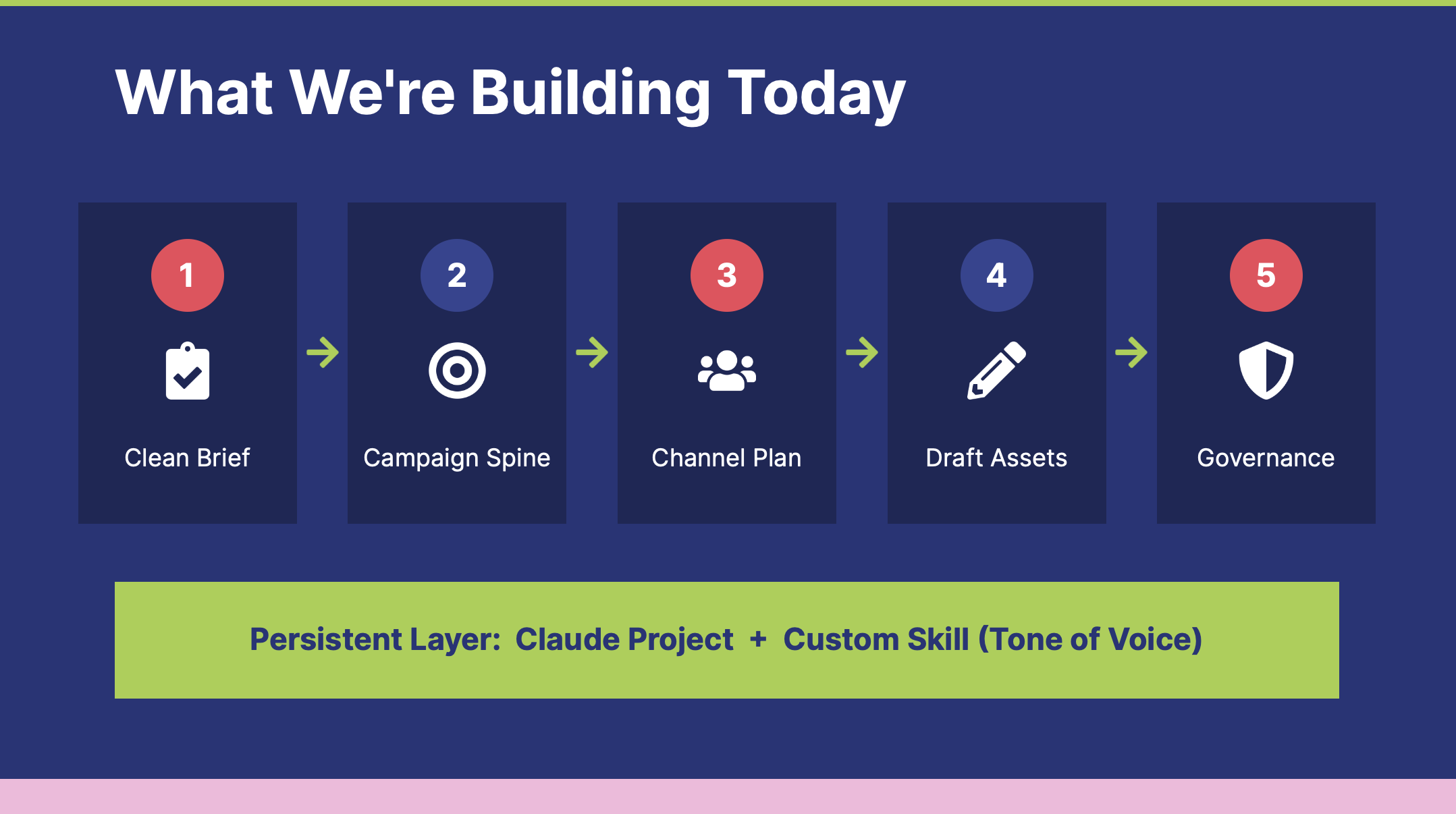 One framing that evolved and felt useful: AI does 30% of the work, you provide 70%. That's not a precise measurement: it's a corrective to the assumption that AI-generated output is finished output. You're the one providing strategic judgment, deciding what's good enough, shaping the draft into something that actually works. The workflow accelerates execution. It doesn't replace expertise.