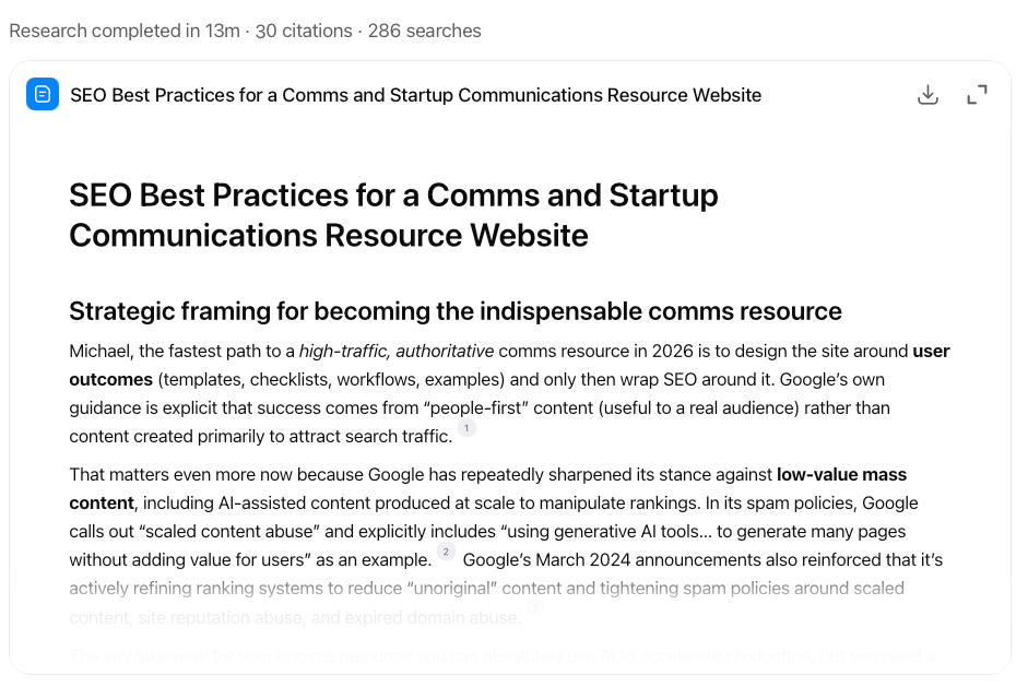 The research phase came first. I used ChatGPT's Deep Research to produce a competitive analysis of the comms template landscape – keyword opportunities, intent classification, and content gap mapping, as well as a technical SEO specification that shaped the information architecture before a line of code was written.