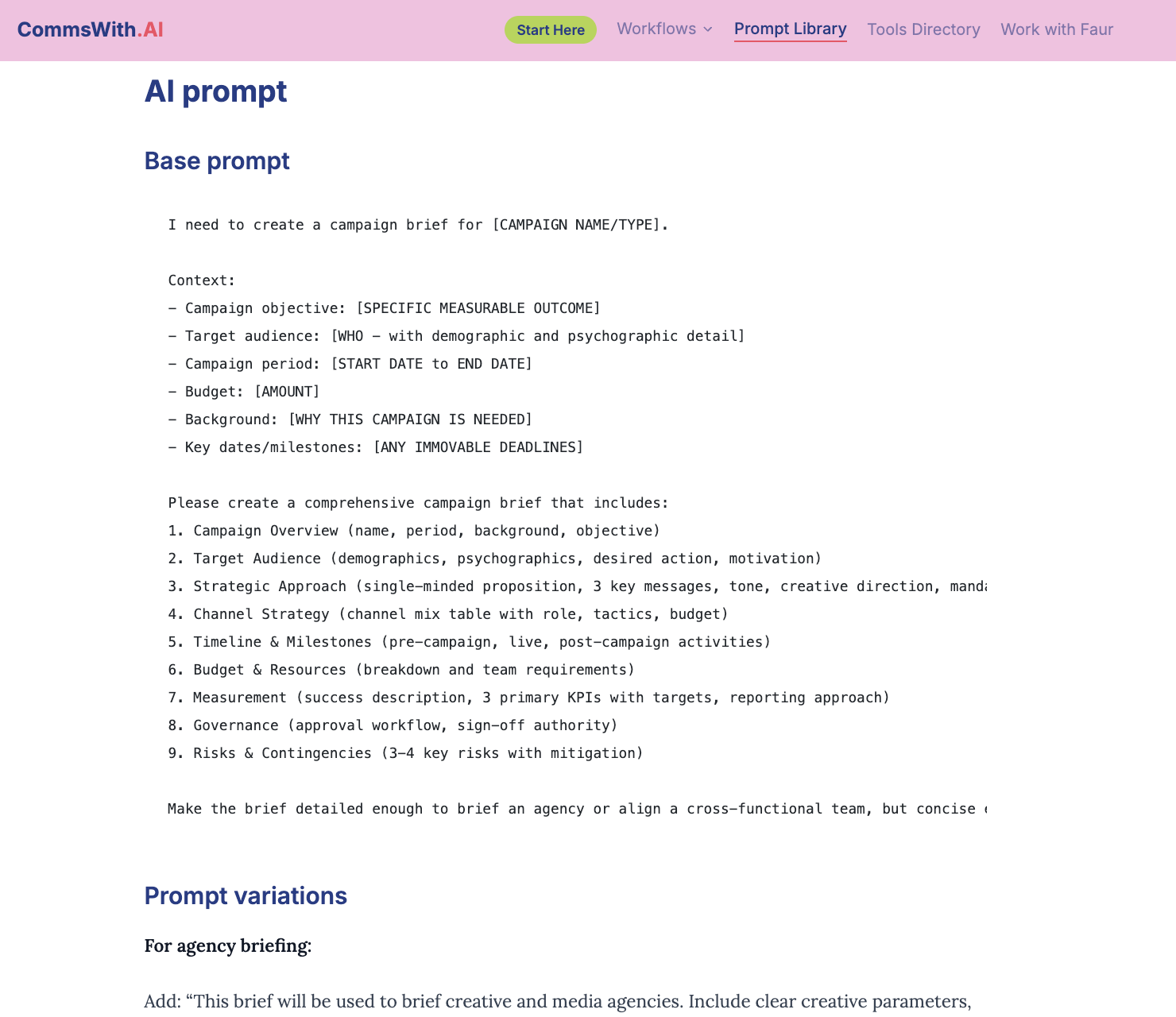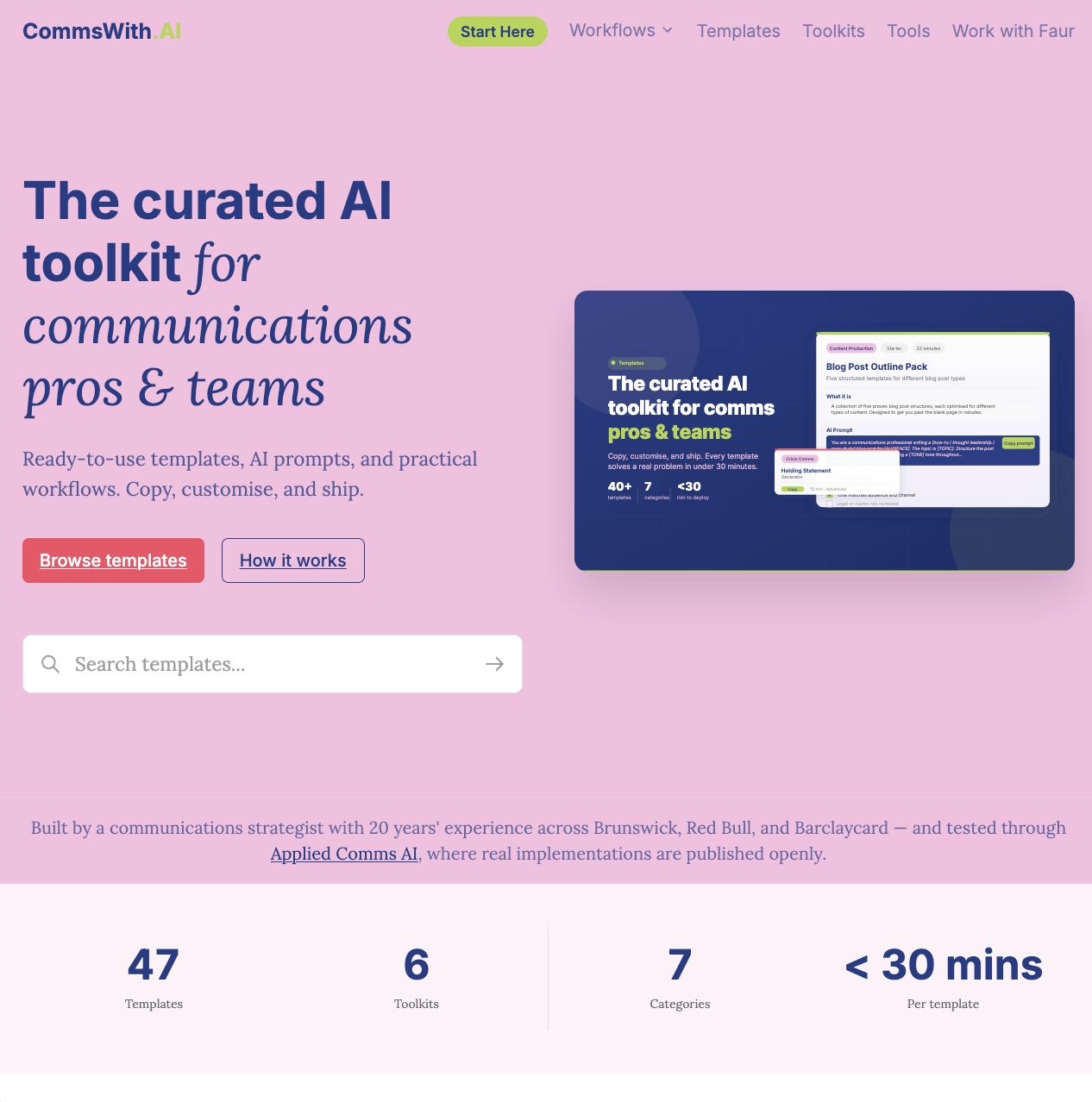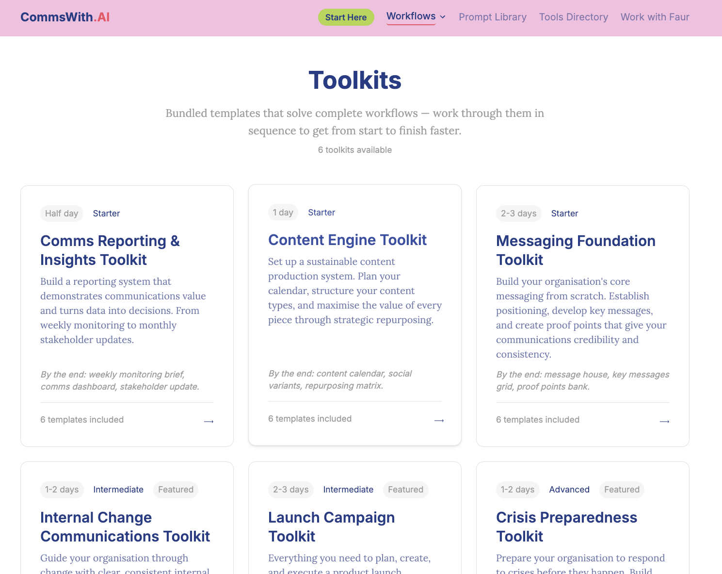 That became the brief for CommsWith.AI as I discussed and landed upon the need with Claude Chat: a template-first resource hub with workflow categories, bundled toolkits, and every template built to a consistent standard – what it is, when to use it, the template itself, a tested AI prompt, a human review checklist, and a real example output.
