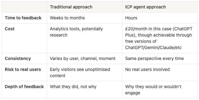 The trade-off is authenticity. An agent can't replicate the full complexity of a real human, and we'll come back to that. But for early-stage iteration – testing whether your positioning is coherent, your language is clear, your CTAs make sense – it's a substantial improvement on guessing.