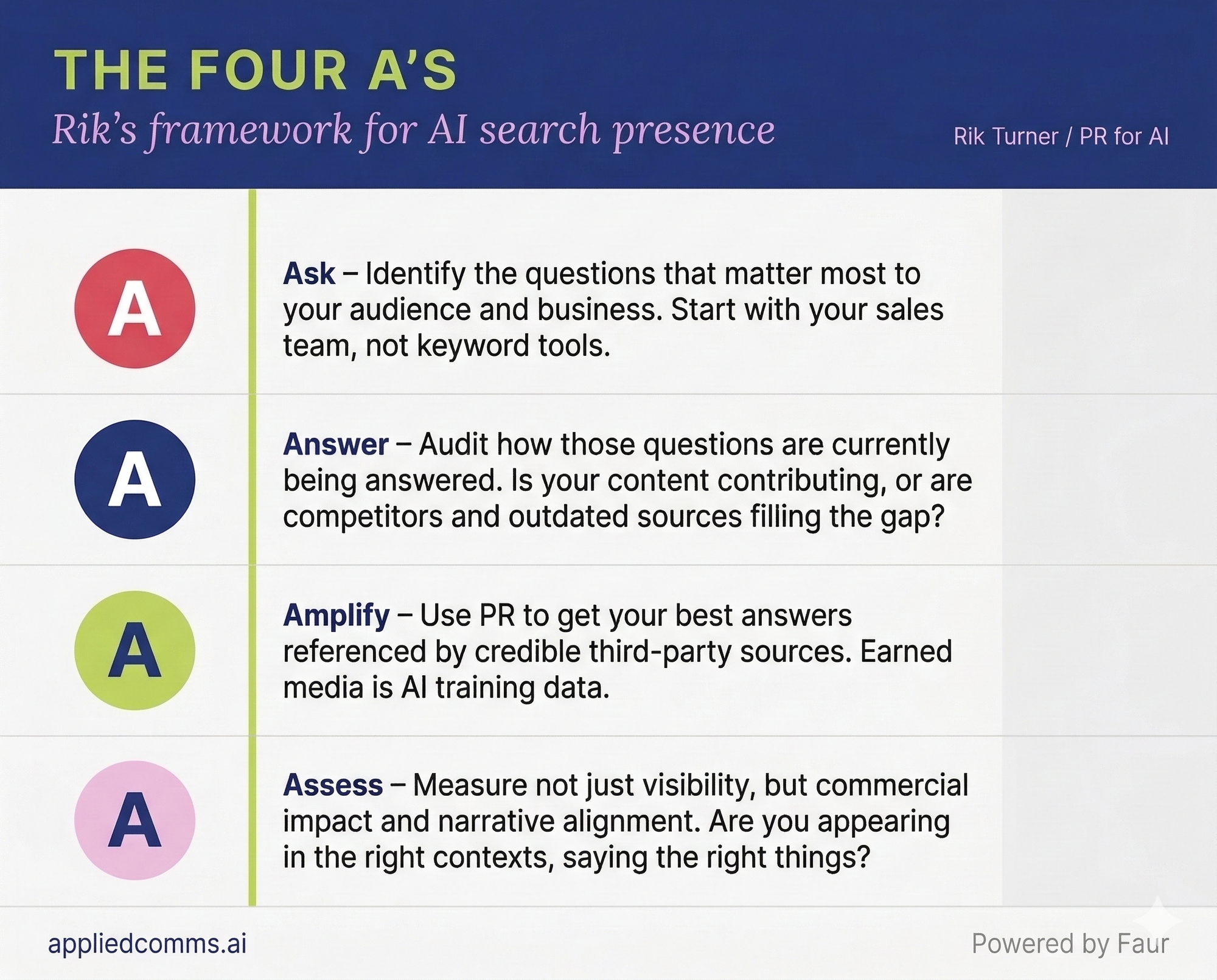 For teams who want to get a handle on their AI search presence without becoming specialists overnight, Rik has developed what he calls the Four A's framework.