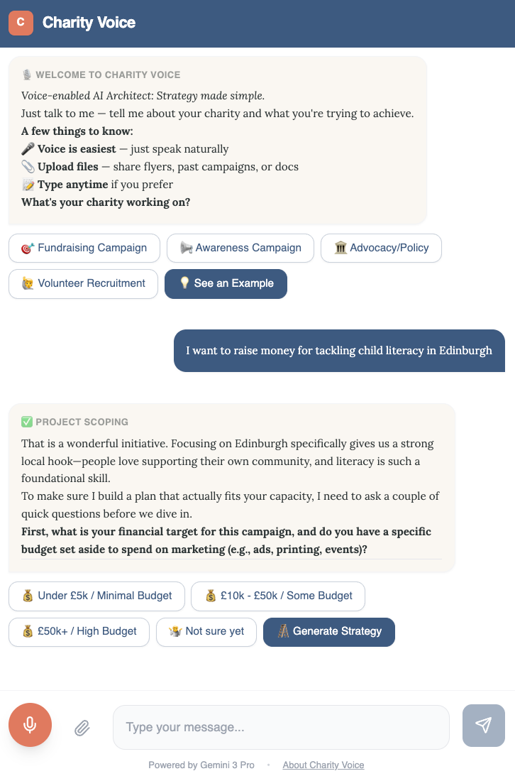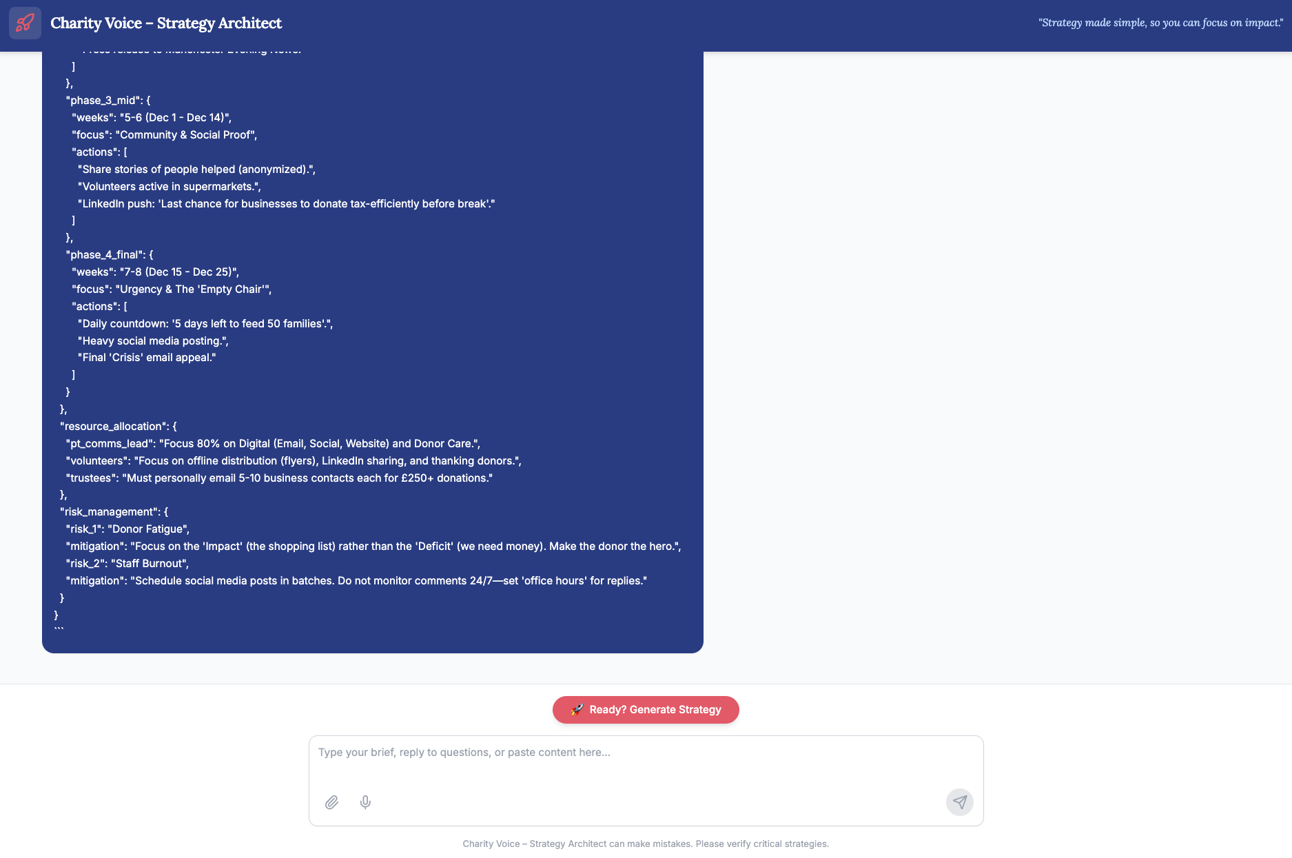 If a charity's goals don't match their resources, Charity Voice challenges them constructively. Claim you'll reach 100,000 people with one part-time staff member and no budget? The AI pushes back before generating a strategy, ensuring recommendations are actually achievable.