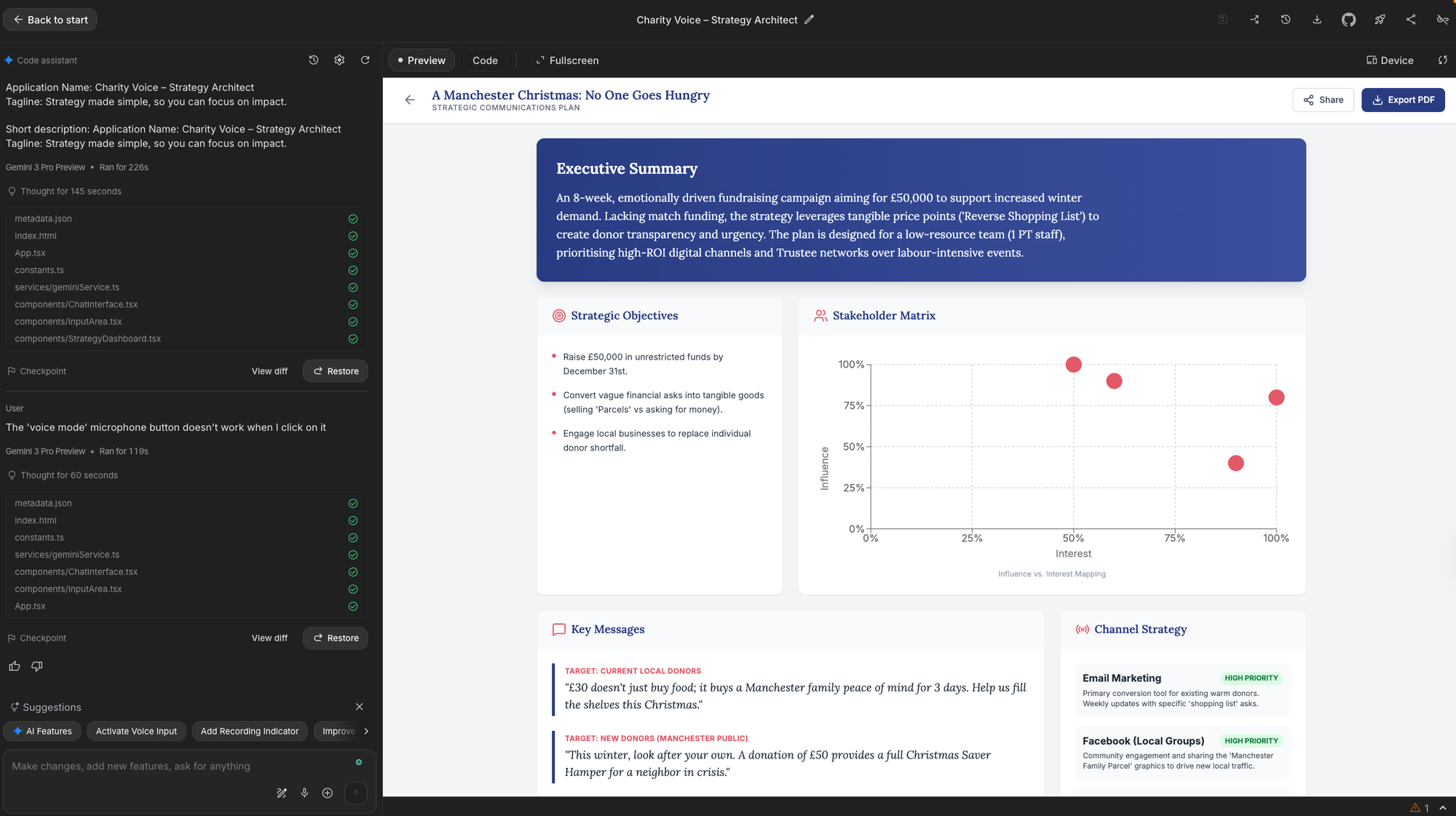 The standout capability wasn't text generation: it was Gemini 3 Pro's ability to plan multi-step solutions, generate code, and produce working outputs. The model doesn't just respond to prompts; it architects solutions (for this reason, at point I named the app as Charity AI Strategy Architect, though that ultimately felt a bit clunky).