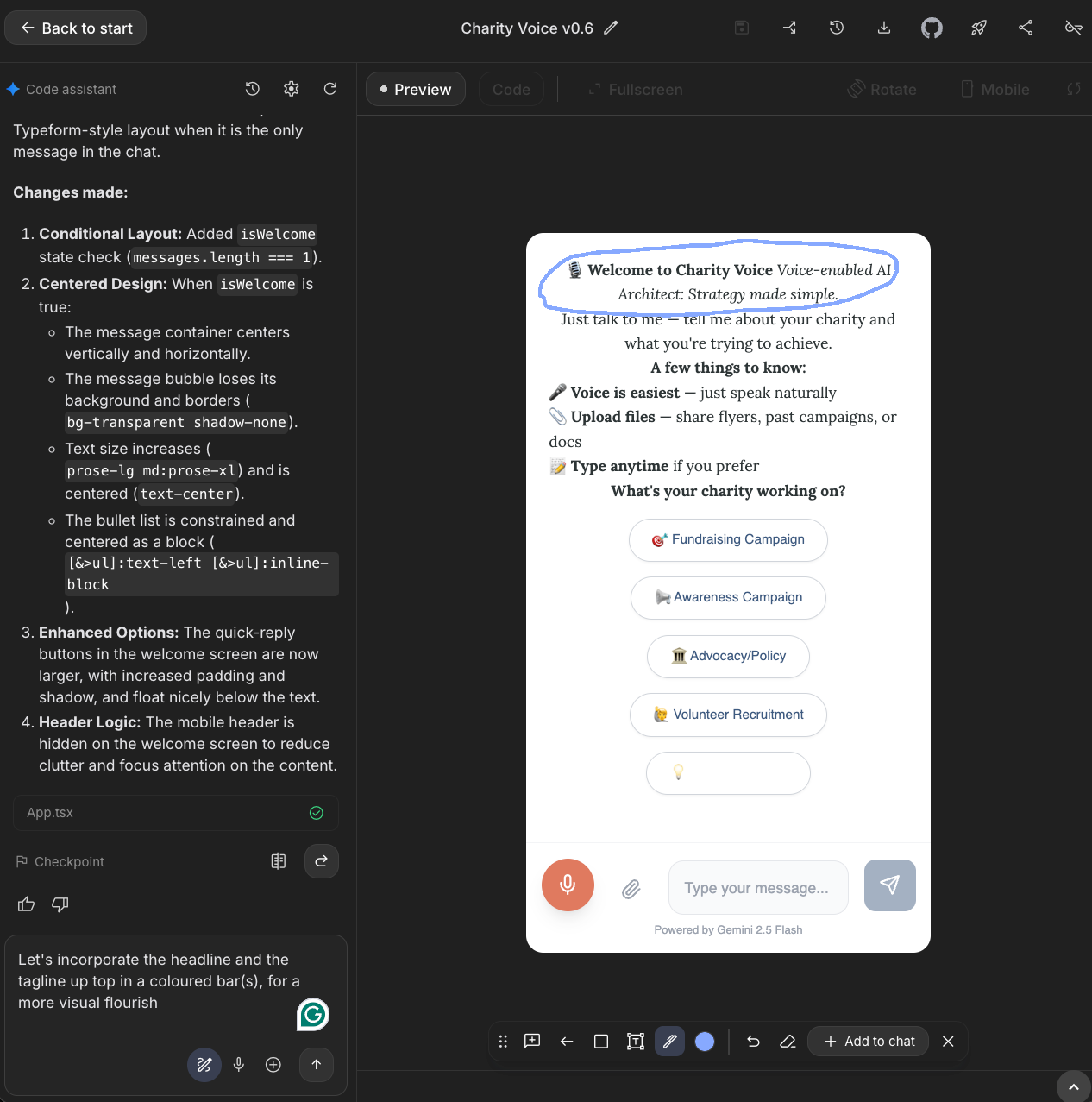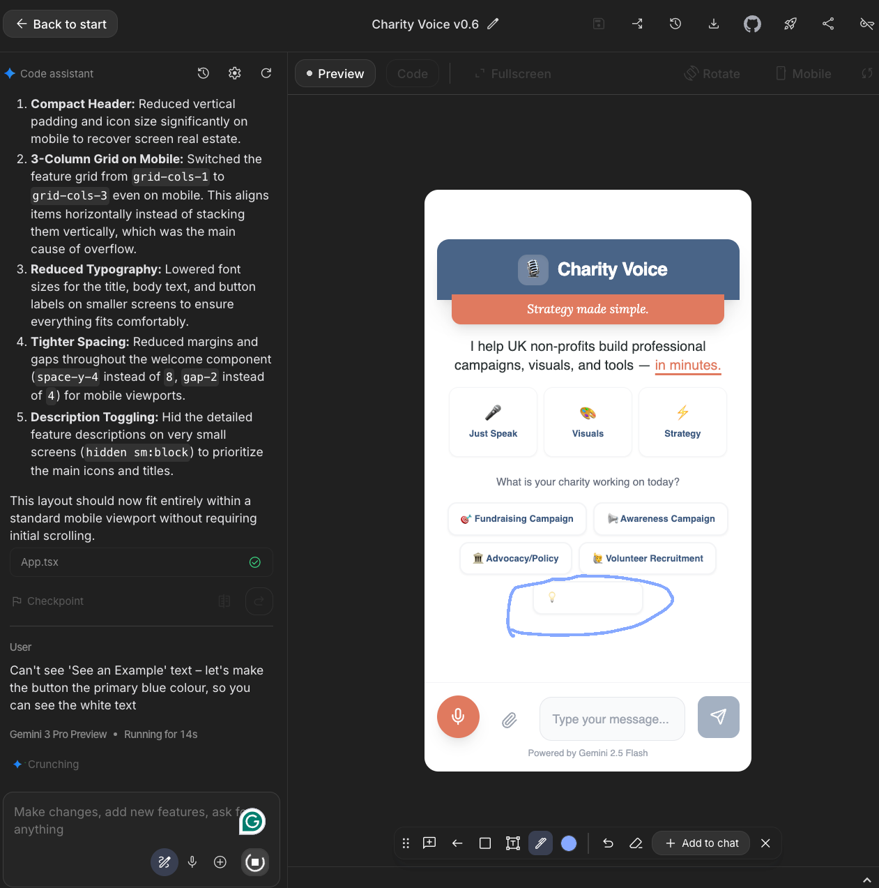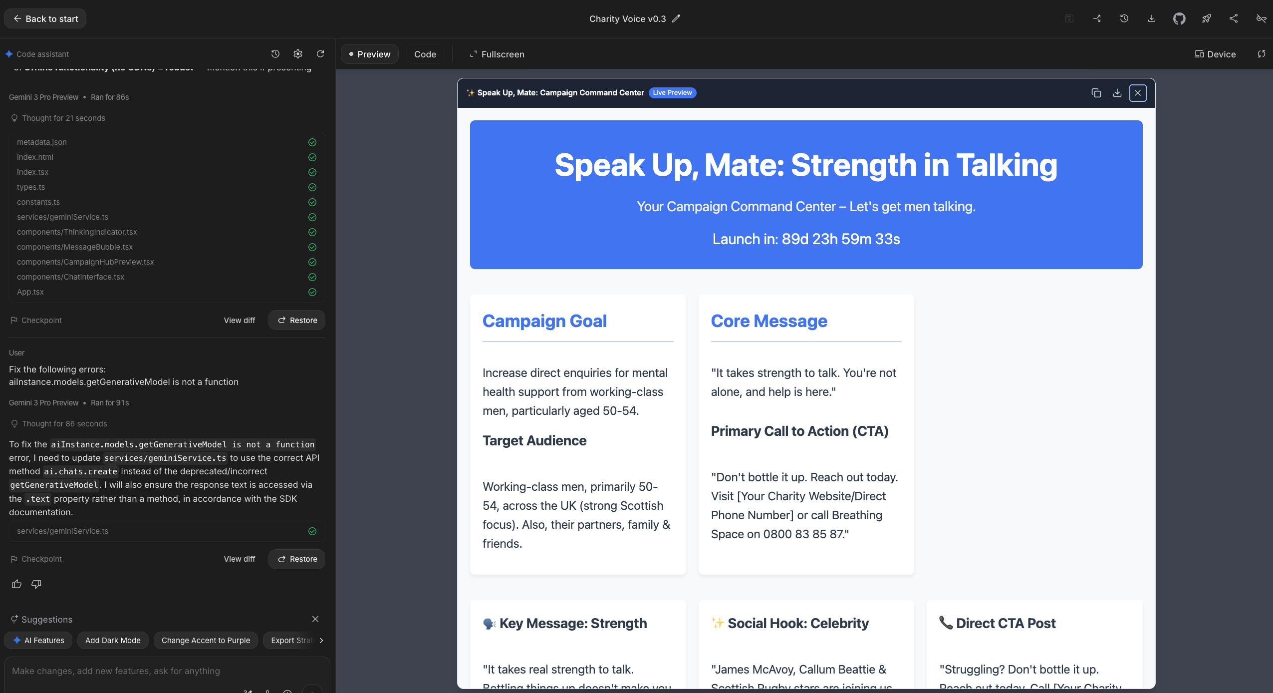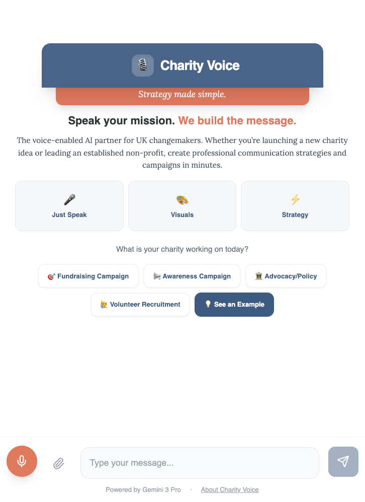 In deciding to take past in Google’s Vibe Code with Gemini 3 Pro hackathon last week, I set out to test how far this latest 'ground-breaking' AI model could actually close this gap. Not to just generate text, but deliver something approaching agency-quality output, complete with the strategic rigour, sector knowledge, and practical constraints that real charity communications require. (In the past, I’ve founded a charity as well as taken on senior interim leadership roles and served as a trustee.)